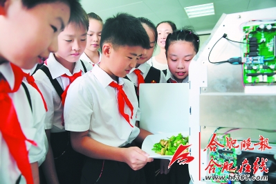在庐阳工业区的一家高科技企业内,几位科大毕业的大学生创业,并发明了一款为“懒人”准备的炒菜机器人,很快将投入市场。