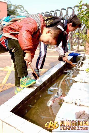 通过“洗礼”之后,旁边还有个长2米,宽40厘米的池子,上面五个水龙头一字排列,旁边放着刷子,毛巾。记者看到一些同学,觉得自己鞋子还不够干净,来到这里,用刷子与毛巾将鞋又刷一遍,然后才开开心心走进教室。