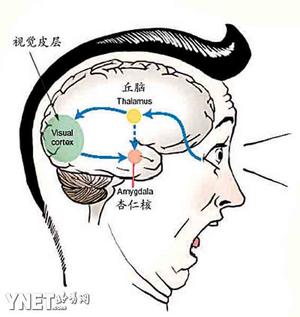 两条道路:大多数视觉信号送往皮层(实线箭头),但也有少部分通过皮层下输送(虚线箭头) 最近,美国科学家终于将杏仁体判断惊恐表情的奥秘揭开。2005年1月6日,著名的英国《自然》杂志以封面文章形式发表了这一研究成果。